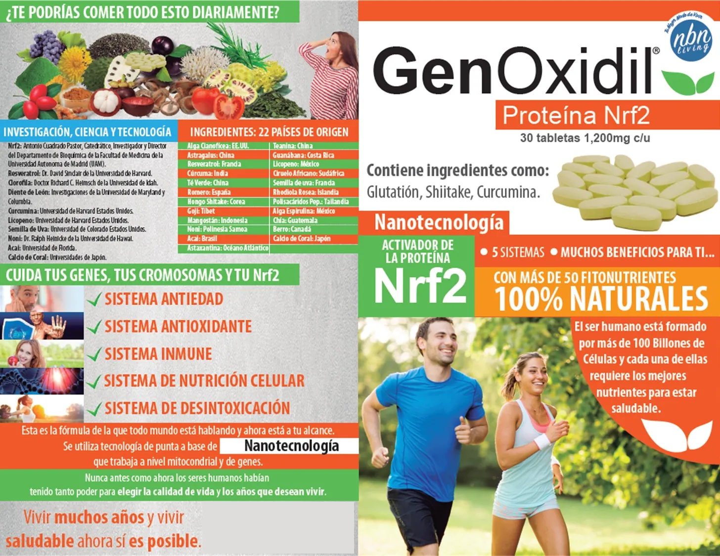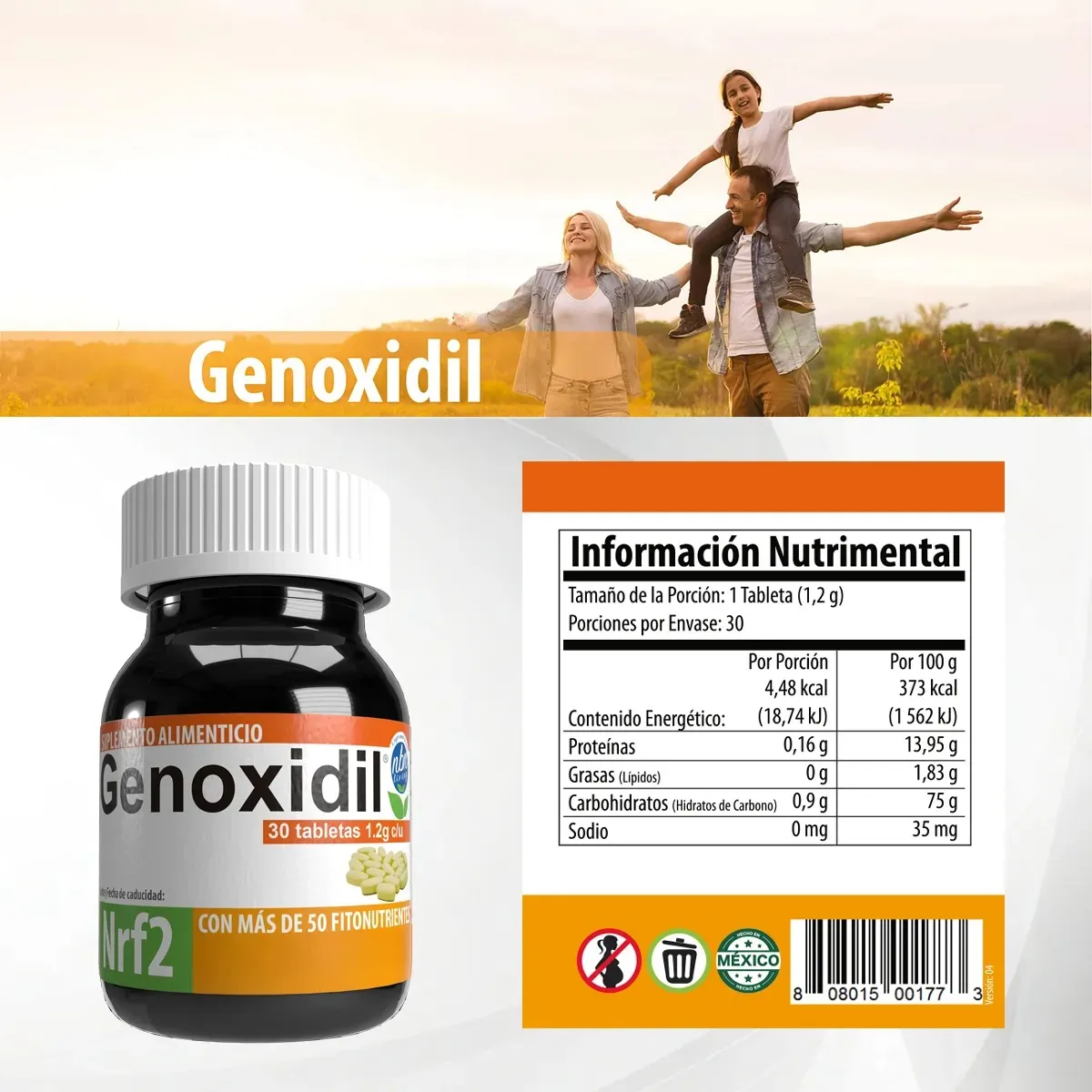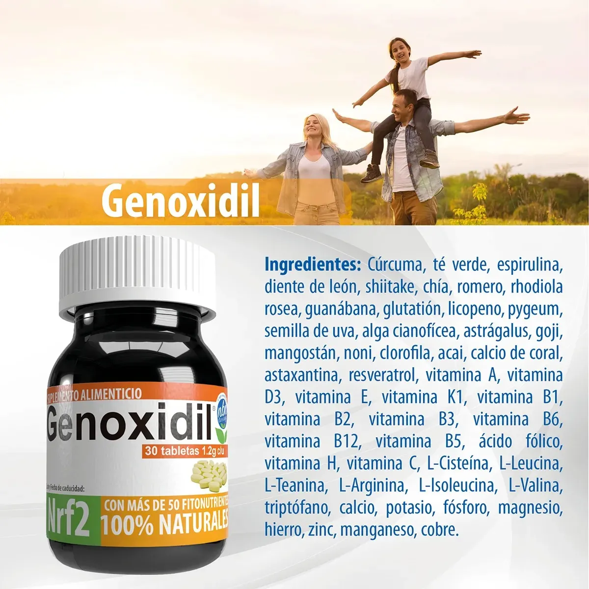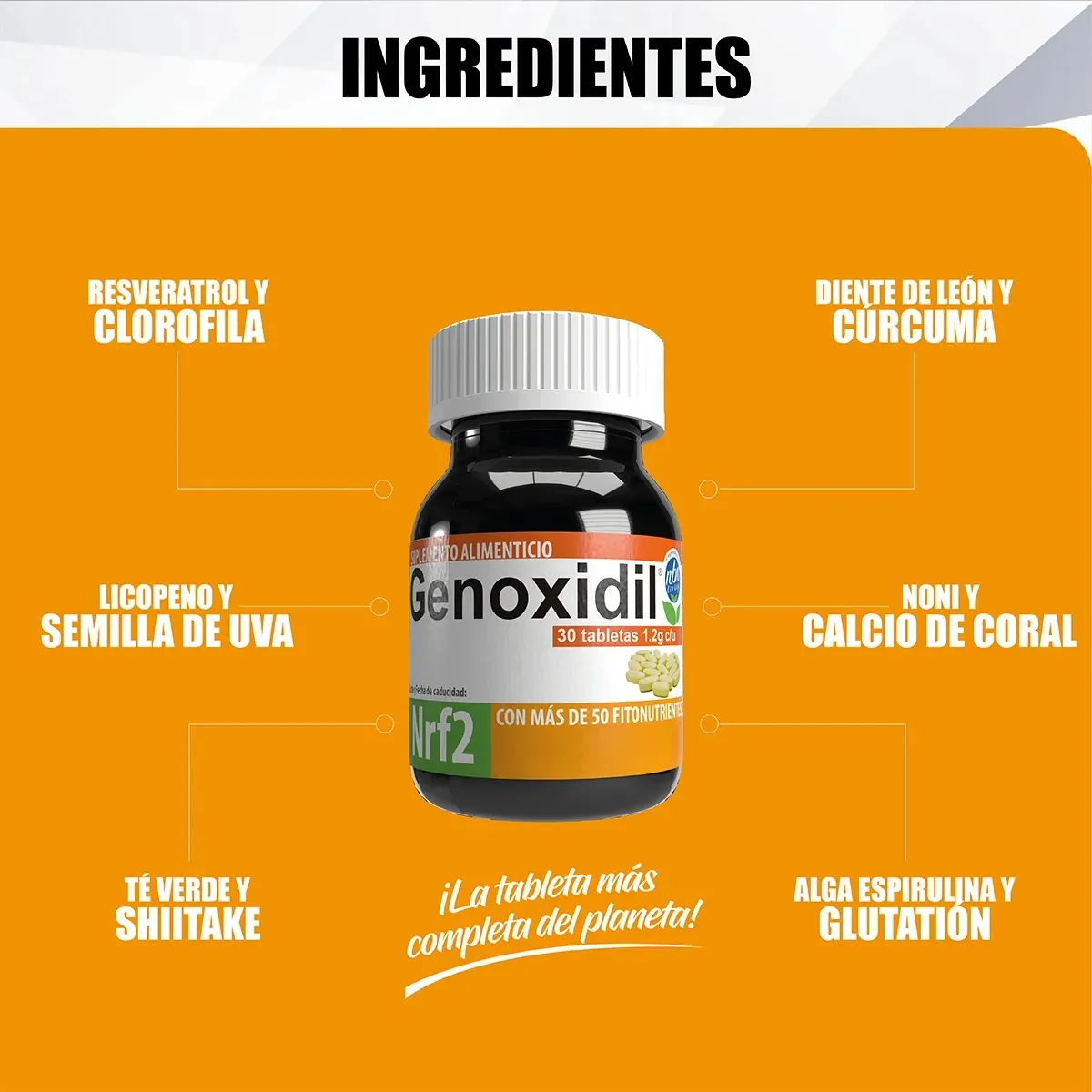 | ACTIVA TU SALUD DESDE ADENTRO CON PODER NATURAL. Genoxidil combina lo mejor de la naturaleza en una fórmula premium con fitonutrientes 100% naturales, diseñada para reforzar tu sistema inmunológico, promover la desintoxicación celular y activar procesos de regeneración desde el nivel más profundo: tus células. Activadores Nrf2 + Glutatión: Potente acción antioxidante que protege tus células del envejecimiento y el daño oxidativo. Cisteína bioactiva y AFA (alga azul-verde): Favorecen la desintoxicación natural del hígado y mejoran la energía celular. Resveratrol + Astragalus + Ganoderma + Shitake + Goji: Refuerzan tu sistema inmune, favorecen la renovación celular y equilibran funciones vitales. Arginina: Mejora la circulación y apoya la oxigenación celular. |
