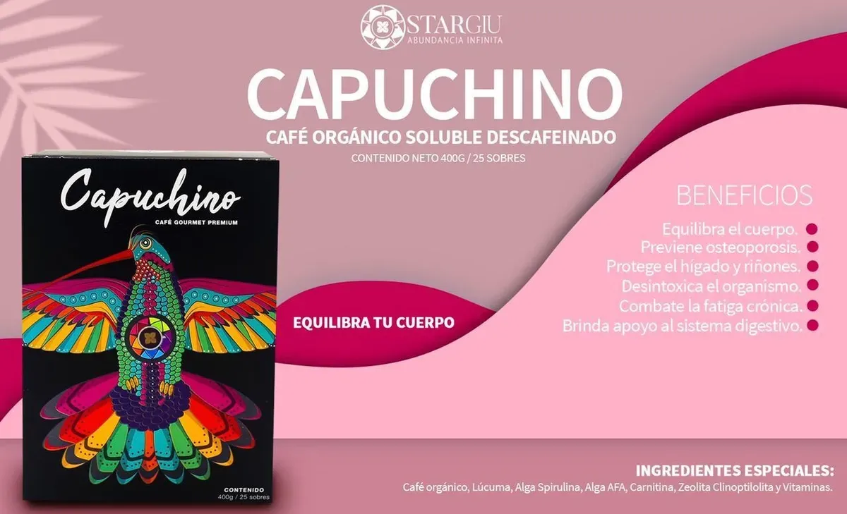 Capuchino Café Orgánico Gourmet STARGIU Deléitate con nuestro Capuchino Café Orgánico Gourmet, una experiencia cálida y reconfortante pensada para quienes disfrutan el café como un ritual diario. Su textura cremosa, su aroma envolvente y su perfil de sabor balanceado lo convierten en una opción ideal para acompañar tus momentos de pausa, enfoque o disfrute. Cada taza está elaborada con café orgánico cuidadosamente seleccionado y una mezcla especial de ingredientes de origen natural, integrados para ofrecer una experiencia diferente, moderna y consciente. Un capuchino diseñado para quienes buscan disfrutar su café favorito con una propuesta innovadora, sin excesos y con total tranquilidad. Nuestra fórmula incluye zeolita clinoptilolita, algas marinas, lúcuma, L-carnitina y un complejo de vitaminas, incorporados como parte de una mezcla gourmet que distingue a STARGIU por su enfoque en la calidad, el origen y la intención de cada ingrediente. ¿Qué lo hace especial? Experiencia sensorial superior Mezcla diferenciada de ingredientes de origen natural Ideal para el ritmo del día a día Practicidad sin complicaciones Presentación: Caja con 25 sobres Este producto es un alimento. No es medicamento. Haz del café un momento especial. |