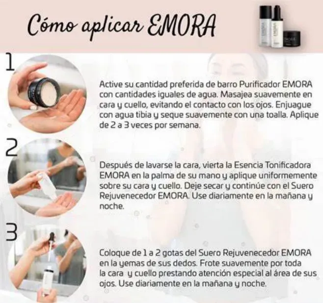Hidrata la piel El suero EMORA ilumina y tonifica la piel, dejándola fresca y rehidratada. Piel Suave Suero EMORA Suaviza la textura de la piel. |