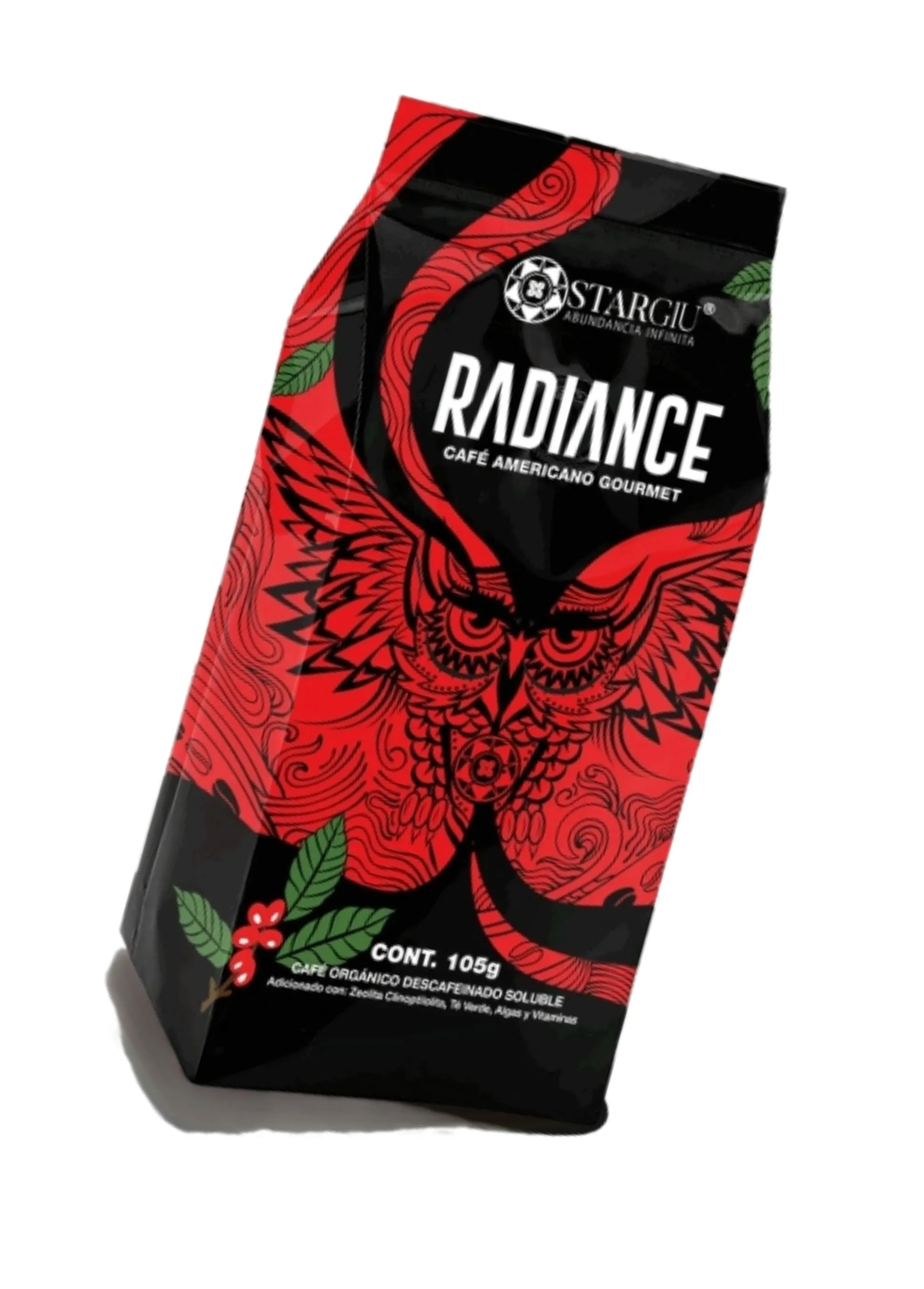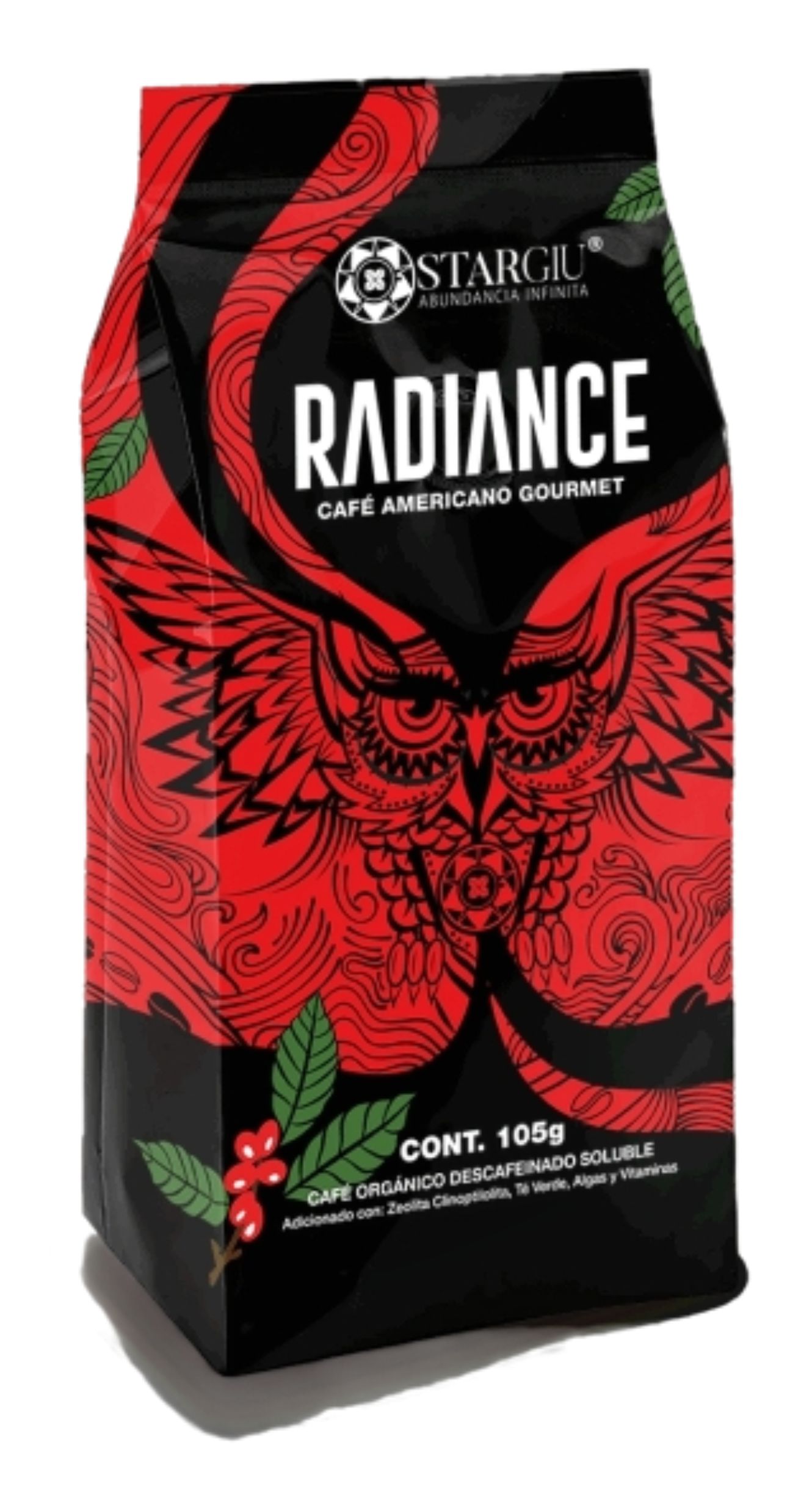 Radiance – Café Orgánico Descafeinado STARGIU · Mezcla Especial | 105 g Radiance BE es un café orgánico descafeinado termogénico que quema grasa, desintoxica y activa tu energía con zeolita, té verde, algas y vitaminas. ¡Siente el cambio desde la primera taza! Presentación: Bolsa | Contenido neto: 105g |
