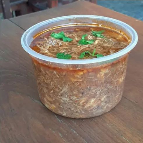Barbacoa de res 1 litro, acompañado de cebolla, cilantro, salsa de tomate con chile y salsa de chile de árbol picosa.