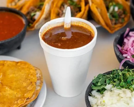 Caldo de barbacoa de res concentrado en vaso de 6 oz, acompañado de cebolla, cilantro, salsa de tomate con chile y salsa de chile de árbol picosa.