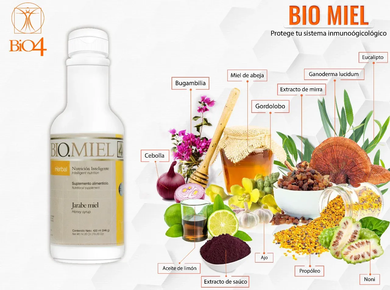 Características del Producto: - Ingredientes Naturales y Potentes: Miel de abeja, cebolla morada, ajo, extractos herbales de bugambilia, sauco, gordolobo, eucalipto y aceite de limón. ¿Cómo BIO.MIEL Puede Ayudarte? - Respiración Más Libre y Saludable: Alivia la congestión y promueve una respiración fluida y natural. Transforma tu Salud de Manera Natural con BIO.MIEL Disfruta de una vida más plena y saludable con BIO.MIEL. Este producto único en el mercado ofrece una solución natural y efectiva para mantener tus vías respiratorias despejadas y tu sistema inmunológico fuerte. ¡Haz tu pedido ahora y experimenta los beneficios de BIO.MIEL! Nota: La información proporcionada no pretende sustituir el consejo médico profesional. |