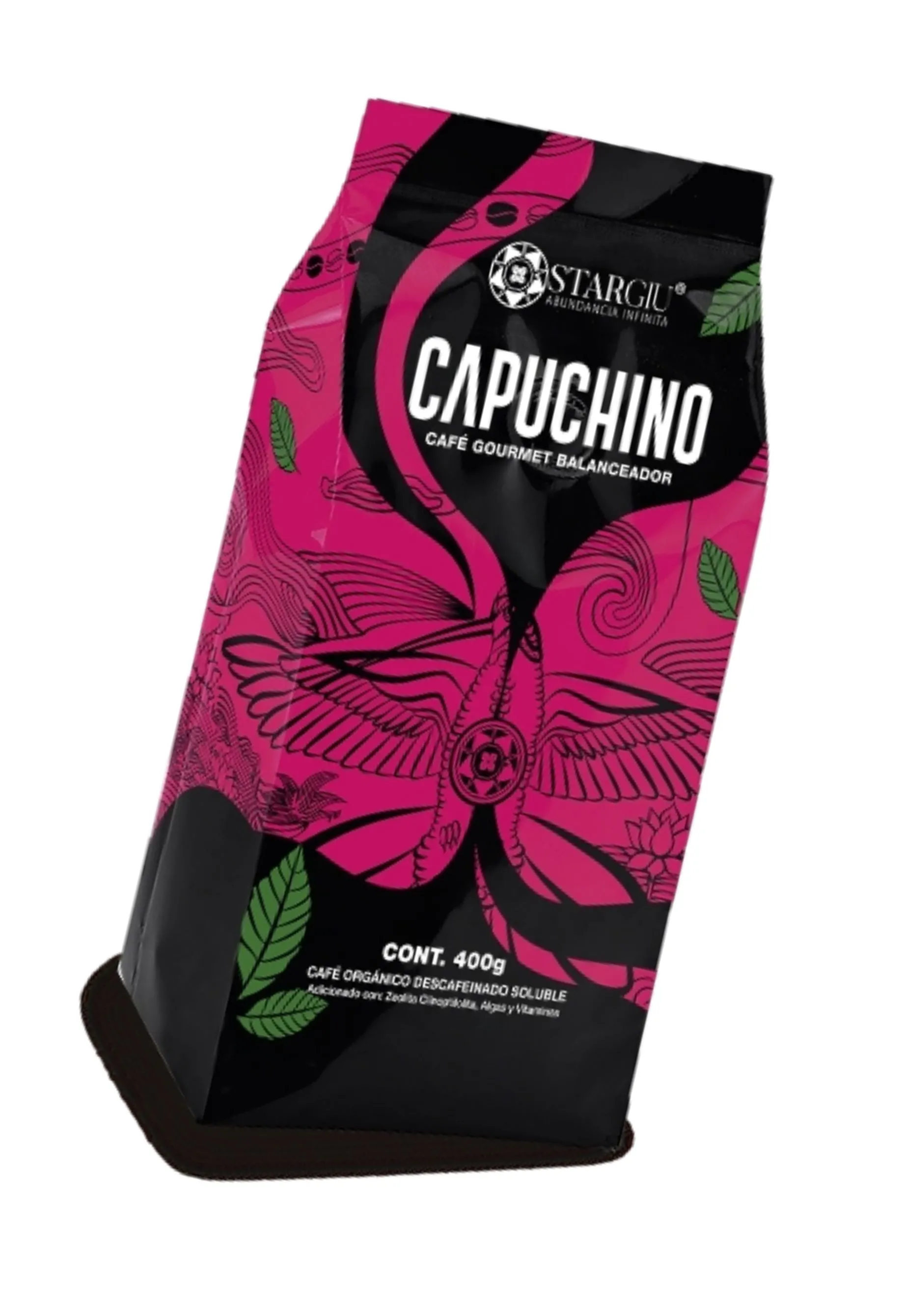 Capuchino Café Orgánico Gourmet STARGIU · Mezcla Especial | 400 g El capuchino café orgánico gourmet de STARGIU adicionado con zeolita y algas marinas desintoxica, balancea y aumenta tu energía naturalmente. ¡Un café que cuida tu salud! Presentación: Bolsa | Contenido neto: 400g |