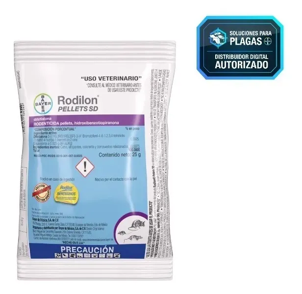Cebo Rata Rodilon Pellets SD 25 Gramos Bayer Es un cebo, atrayente, colorante y compuestos relacionados. Rodenticida anticoagulante unidosis en pellets, con elevada efectividad para el control de ratas y ratones. La fórmula Rodilon® Pellets SD es inteligente Por su forma de acción, actúa sobre los roedores sin alertarlos, permitiendo que toda la población consuma el cebo logrando alta eficacia en el control. Uso fácil y práctico. Producto listo para usarse y su presentación en prácticos pellets, permite servirlos directamente del sobre. Por su forma de acción, actúa sobre los roedores sin alertarlos, permitiendo que toda la población consuma el cebo logrando alta eficacia en el control. Uso fácil y práctico. Producto listo para usarse y su presentación en prácticos pellets, permite servirlos directamente del sobre. |