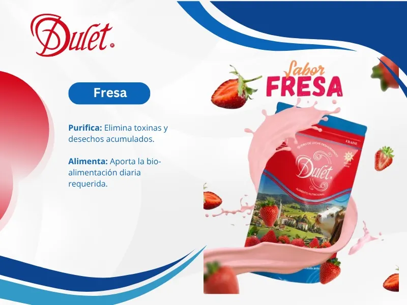 Para qué sirve? Aporta nutrientes: Es una fuente de alta calidad proteica gracias a su concentración de 19 aminoácidos esenciales. Mejora el sistema inmunológico: Contiene vitaminas, minerales y bioelementos que ayudan a fortalecer las defensas del cuerpo. Salud digestiva: Contribuye a una mejor función gástrica y ayuda a eliminar toxinas del organismo. Belleza y salud: Los nutrientes presentes en el lactosuero, como la vitamina C, son importantes para la formación de colágeno y elastina, lo cual beneficia la piel, el cabello y las uñas. Precursor de Glutatión: El Dulet actúa como un precursor del glutatión, una sustancia vital para el cuerpo que ayuda a desintoxicarlo y regenerar las células. ¿Qué contiene? Lactosuero suizo: Es el ingrediente principal, obtenido de vacas y producido bajo altos estándares de calidad. 41 bioelementos: Una concentración de 11 vitaminas, 11 minerales y 19 aminoácidos. Chispas de fresa deshidratada: Que le dan su sabor característico. ¿Quién puede consumirlo? Es un producto apto para toda la familia. Es ideal para complementar una dieta equilibrada. Prueba y comprueba sus beneficios! Siéntete seguro ya que cuentas todo el apoyo empresarial por que estas comprando directamente con Dulet International Group |