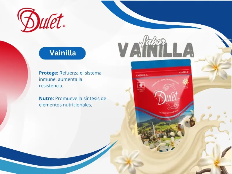 DULET es un lactosuero suizo en polvo, 100% natural, que se presenta en diferentes sabores, incluyendo vainilla. Este producto es una fuente de proteína de alta calidad, que contiene 41 bioelementos (11 vitaminas, 11 minerales y 19 aminoácidos esenciales) y se considera libre de azúcar, lactosa, caseína y grasa. Características de DULET Sabor Vainilla Origen: suizo. Formato: Suero deshidratado en polvo. Composición: Contiene 11 vitaminas, 11 minerales y 19 aminoácidos esenciales, y es libre de lactosa y caseína. Beneficios: Aporta proteínas de alta calidad, aminoácidos esenciales y bioelementos. Presentación: Viene en un envase de 450 gramos, con sabor a vainilla. Usos: Se puede disolver en agua o leche para crear un batido o utilizarse en recetas de repostería. |