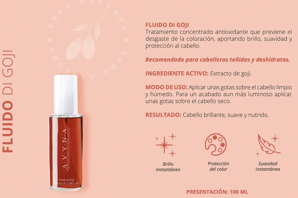 Di Goji Las bayas de Goji se han utilizado en China durante miles de años para mejorar la salud y la longevidad. Es uno de los alimentos más ricos en nutrientes en el mundo debido a su alto rango de fitonutrientes, antioxidantes, vitaminas y más. El Goji, gracias a la gran cantidad de antioxidantes que contiene, ha demostrado tener propiedades anti envejecimiento. CABELLOS CON COLOR Nueva línea vegana, libre de sulfatos , contiene propiedades proteicas y antioxidantes con las cuales refuerza y regenera la estructura interna del cabello. Prolonga la fidelidad del color y lo protege de los rayos UV, manteniendo por más tiempo el color brillante y los efectos del alaciado gracias a sus ingredientes activos como Extracto de Goji. |