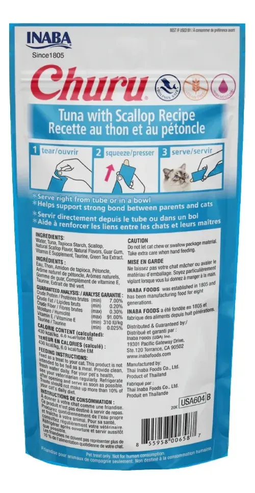 El secreto de Churu, que lo convierte en la golosina favorita de los gatos, son los ingredientes 100% naturales de grado humano. Su carne se deriva de pollo criado naturalmente en granjas supervisadas de cerca, con atún de aguas profundas cosechado de forma sostenible y certificado como dolphin safe. Más hidratación: Es un alimento especialmente creado para la pérdida de líquidos que pueda tener tu gato, para aquellos que están enfermos o deshidratados Bajas calorías: Con sólo 6 kcal por tubo, contiene una décima parte de las calorías de los snacks secos ¡Muy saludable! Cada paquete contiene 4 tubitos de 14 gr c/u (Total 56 gr). No sustituye la comida. Se puede dar directamente desde el tubo, en el plato o sobre la comida seca. Una vez abierto, mantener refrigerado Las ventajas de este producto son: Más Hidratación: Es un alimento especialmente creado para la pérdida de líquidos que pueda tener tu gato, para aquellos que están enfermos o deshidratados Libre de Granos: Esté producto es libre de granos, sin conservantes ni colorantes. Sabor a Atún y Ostión: Cuenta con exquisito sabor a atún y Ostión que le encantará. Cremoso: Con textura cremosa, fácil de ingerir. Perfecto para lamer desde el envase. Puré de textura cremosa con altos niveles de humedad para una salud óptima de felinos. Simplemente abre el tubo y aprieta un poco para alimentar a tu gato ya sea a mano, en su plato o lo puedes usar como un sabroso aderezo en alimentos húmedos o secos. Ideal para acompañar medicamentos El Churu Atún y Ostión no sustituye a la comida. Se puede dar directamente desde el tubo o sobre el plato de comida seca. Mantener refrigerado una vez abierto |