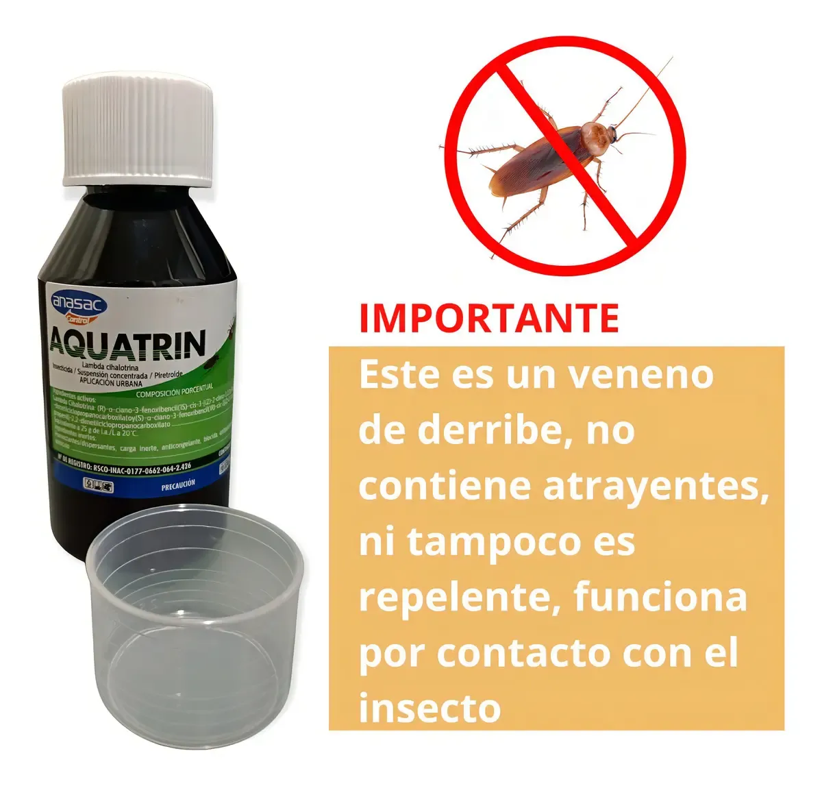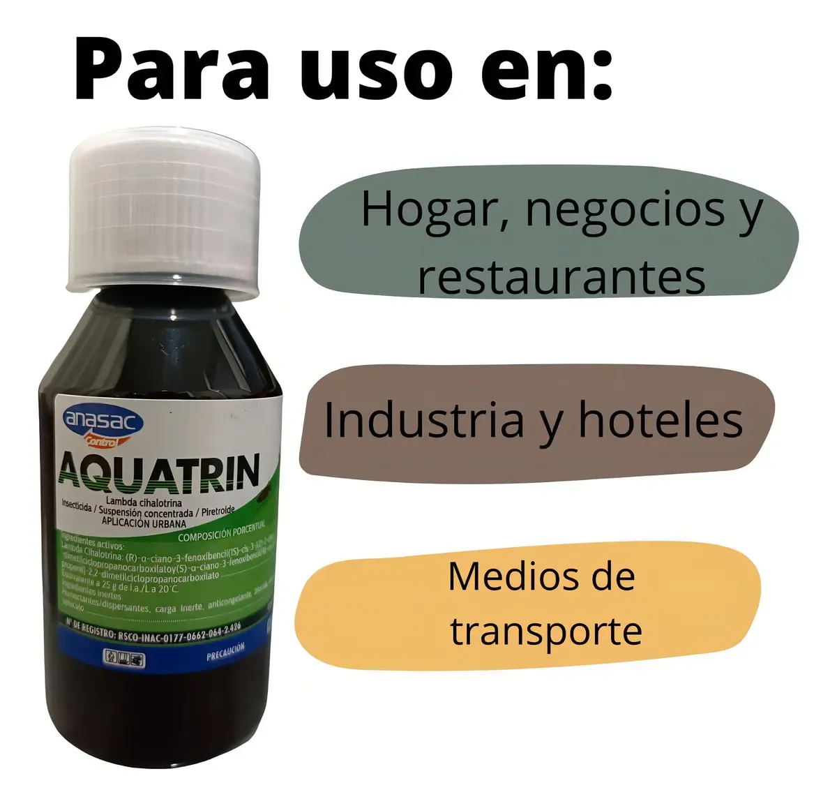 Insecticida Mosquitos y Moscas 100 ml Aquatrin Marca Anasac AQUATRIN actúa por ingestión y contacto. Una vez dentro del insecto, altera el tránsito de iones de sodio y de potasio en la célula nerviosa, provocando parálisis y la muerte. AQUATRIN puede ser aplicado en interior o exterior de casinos, cocinas, hoteles, medios de transporte, industrias, residencias, entre otros.