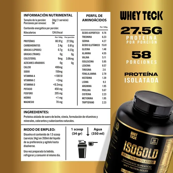 Es una proteína isolatada, libre de grasa y de lactosa, de fácil y rápida asimilación, con una concentración del 90% de proteína, ideal para la definición muscular. Esta fórmula sin azúcar y libre de lactosa te brinda 27.5 gramos de pura proteína en cada porción. Su sabor es muy agradable y muy delicioso, ¡estamos seguros que te va a encantar! IsoGold es una proteína de suero de leche de alta calidad, formulada para quienes buscan optimizar su rendimiento físico, acelerar la recuperación muscular y mejorar su composición corporal. Con una concentración superior al 90% de proteína por porción, IsoGold es ideal para la definición muscular y el desarrollo de masa magra. Su fórmula avanzada incluye aislado e hidrolizado de suero, probióticos, BCAA's, EAAs y MCTs, garantizando una absorción rápida y eficiente. INGREDIENTES: Concentrado de proteína isolatada de suero de leche Stevia Formulación de vitaminas y minerales Colorantes y saborizantes naturales |