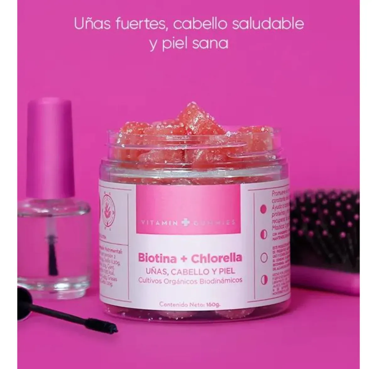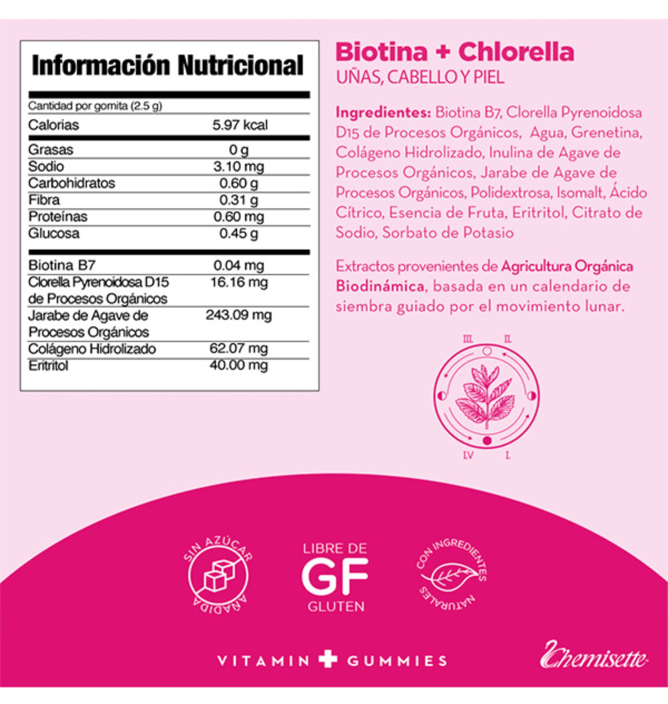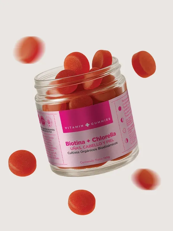 BENEFICIOS: Aporta proteínas específicas y antioxidantes para recuperar la elasticidad y salud de la piel. Mantiene el cabello y las uñas en constante crecimiento. Mezcla única de micronutrientes, útil en casos de pérdida de cabello. Hechas con Biotina y Chlorella Antroposóficas. MODO DE USO: Masticar 2 gomitas al día.