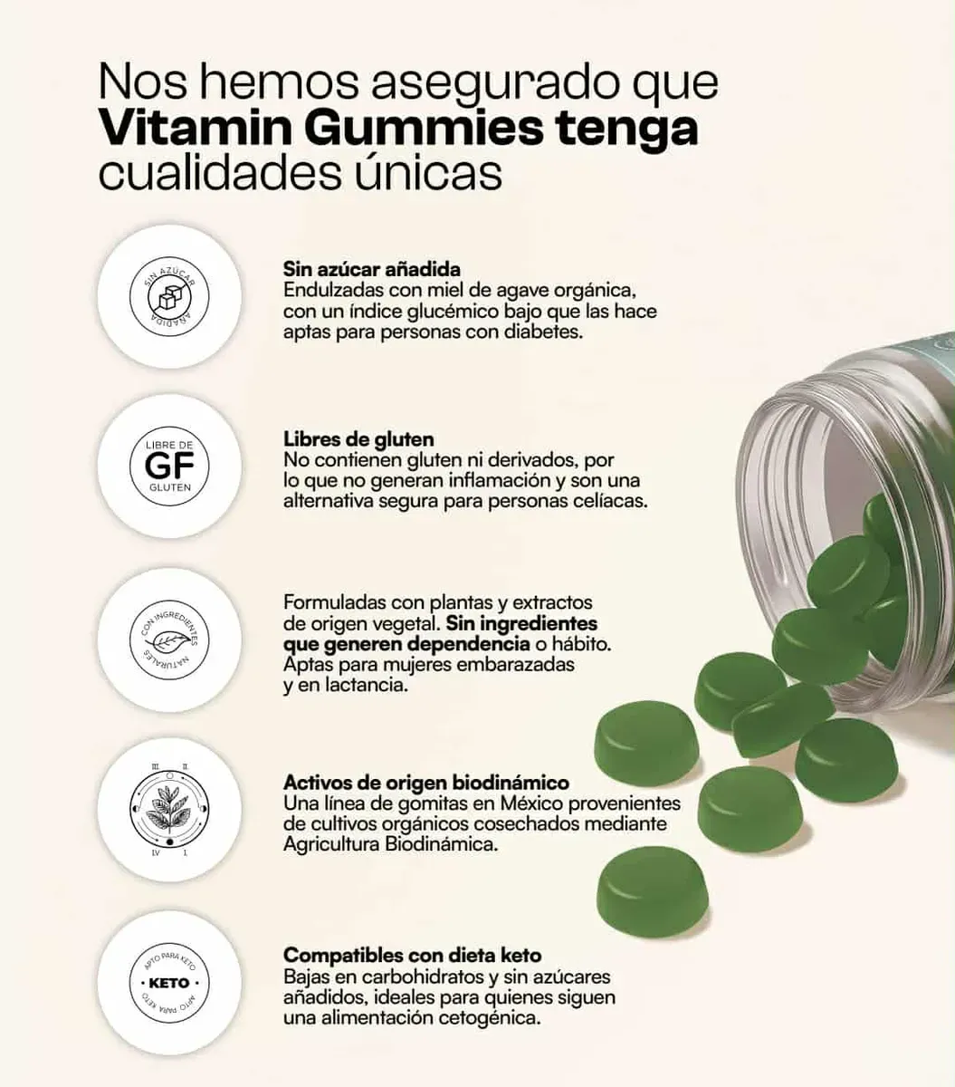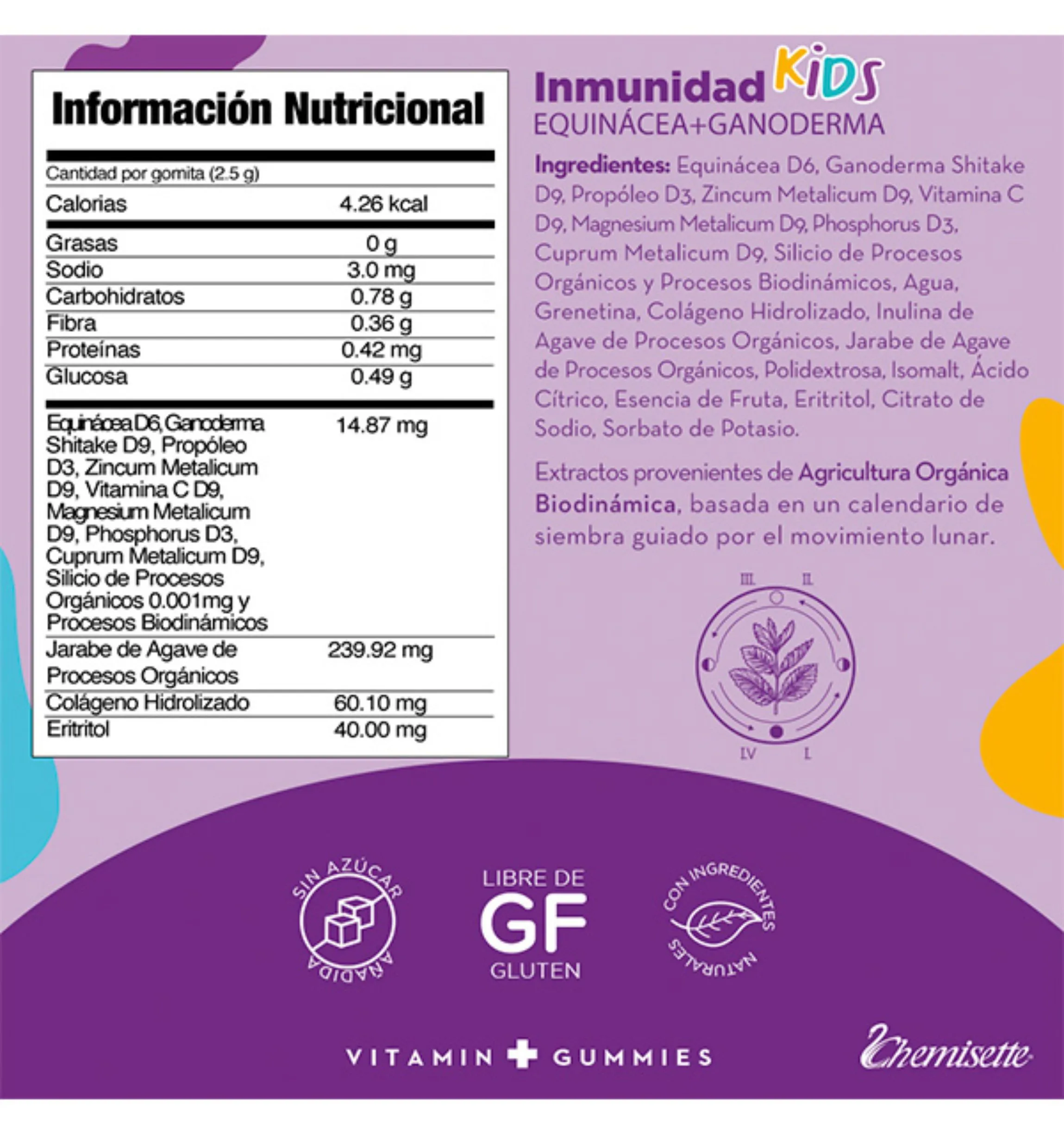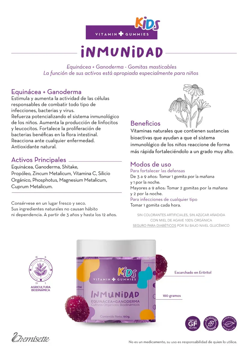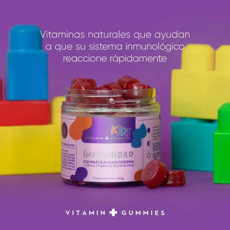 BENEFICIOS: La dosis perfecta para niños que refuerza su sistema inmune y eleva las defensas para prevenir algún contagio por sus ingredientes como Equinácea D6, Ganoderma, Shitake D9, Vitamina C. Sin azúcar añadida, sin gluten, sin colorantes artificiales. MODO DE USO: Masticar 2 gomitas por la mañana y 2 por la noche. Dosis para niños de 3 a 9 años, niños mayores de 10 años pueden tomar Vitamin Gummies Inmunidad para adultos y proteger su sistema inmune de una manera efectiva. |