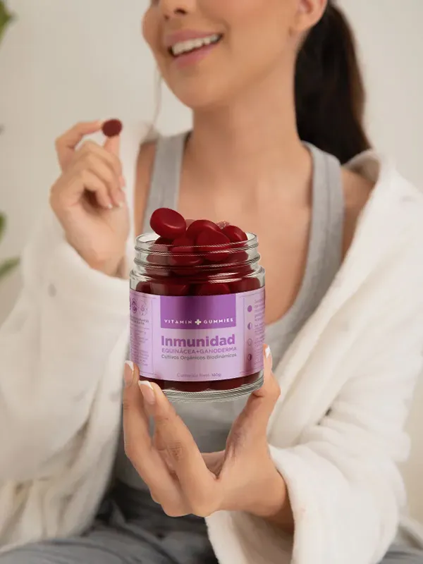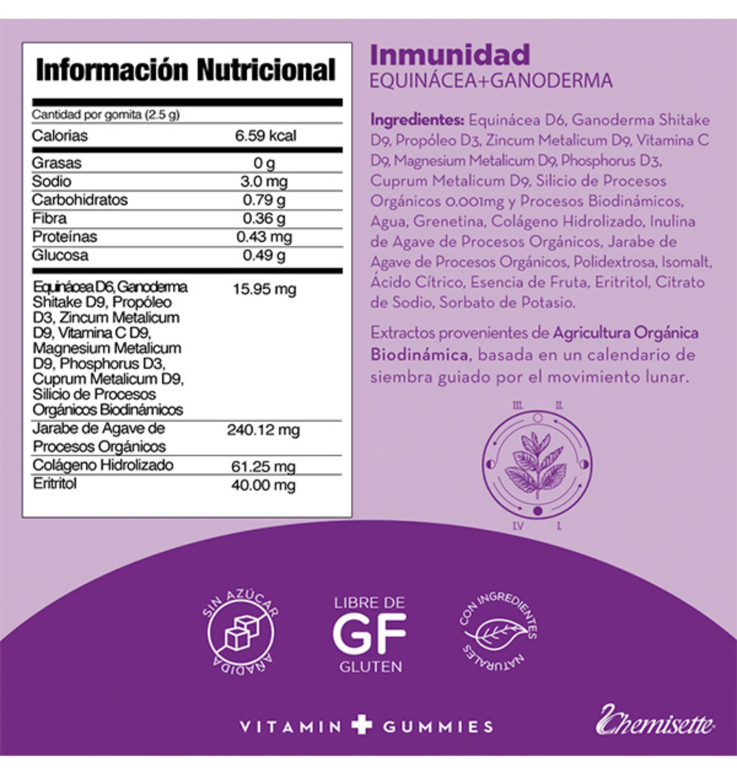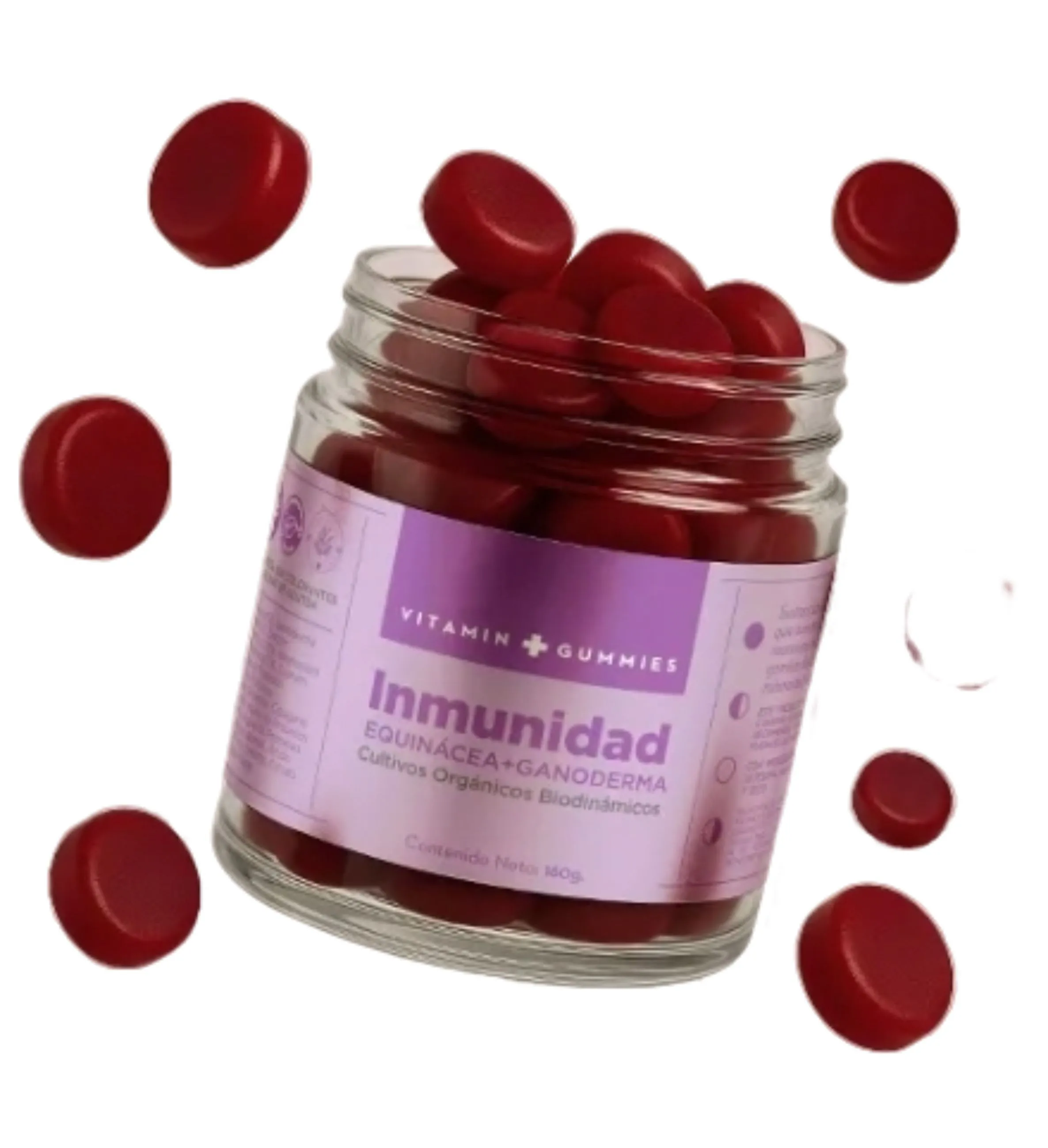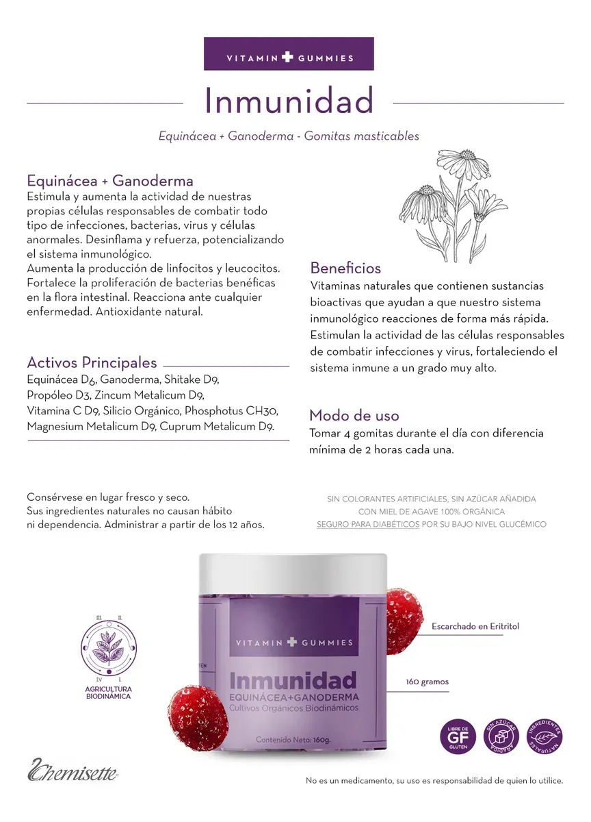 BENEFICIOS: Refuerza tu sistema inmune y eleva tus defensas para prevenir algún contagio por sus ingredientes como Equinácea D6, Ganoderma, Shitake D9, Vitamina C. Sin azúcar añadida, sin gluten, sin colorantes artificiales. MODO DE USO: Masticar 4 gomitas durante el día con diferencia mínima de 2 horas cada una. |
