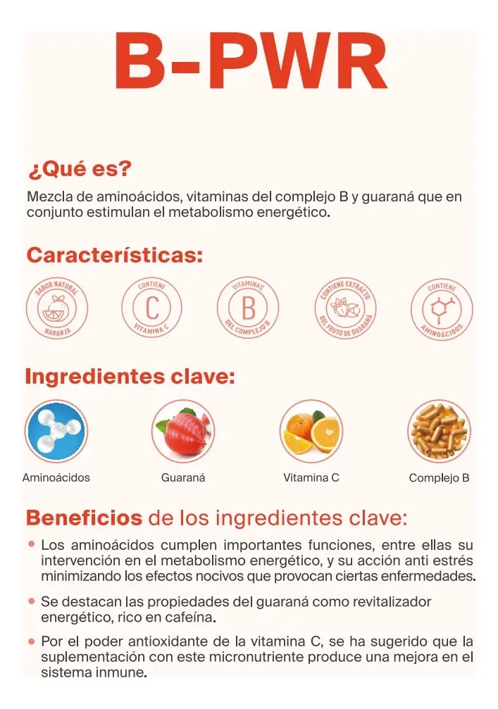 | B-PWR Bodylogic, ayuda a estimular de manera positiva el sistema nervioso central, y aumentar el estado de alerta, y energía, gracias a su contenido que favorece el rendimiento físico, disminuye el tiempo de recuperación post ejercicio, y elimina la pesadez durante el día. Contiene aminoácidos, guaraná, vitamina C y vitaminas del complejo B, con delicioso sabor a naranja. Beneficios Aumente el flujo sanguíneo y la oxigenación . Ayuda a la producción de energía. Disminuye la fatiga. Mejora el rendimiento físico y vitalidad. ¿Cómo se toma? Disolver un sobre 5g. en 500 ml de agua . Tomar 1 porción al día durante el ejercicio o en el horario de su preferencia. Recomendación Para mejores resultados combinarlo con los demás productos del B-Shake , y seguir la guía nutricional y plan de ejercicio. Presentación 150 gr. 30 sobres de 5 gr cada uno |
