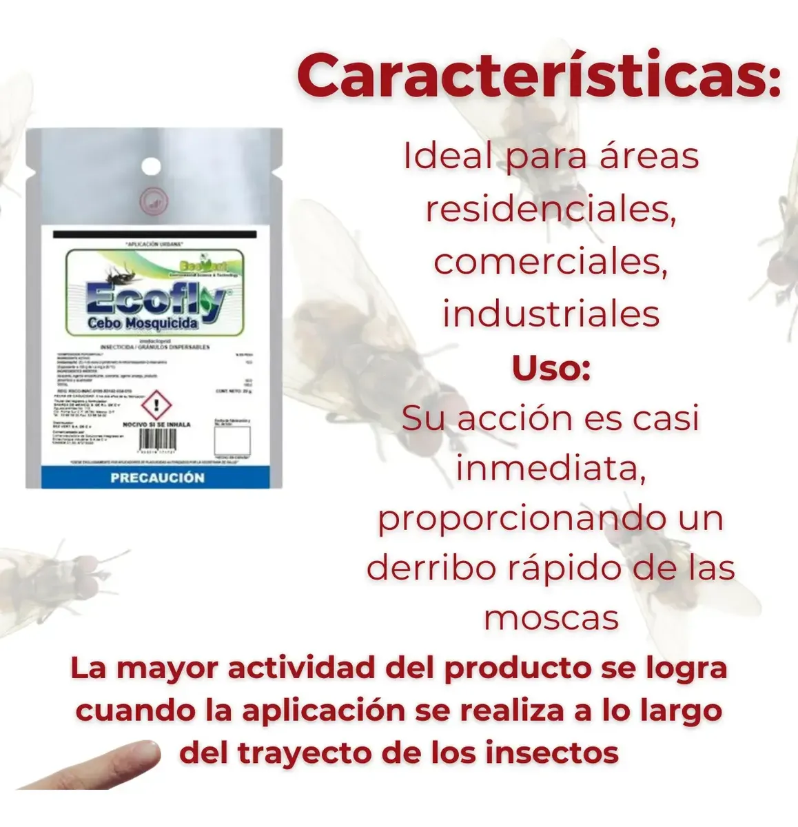 El producto se aplica directamente como granulo seco, esparcido en el suelo o en pulverización dirigida a superficies, previa dilución en agua, en zonas donde proliferen las moscas.
