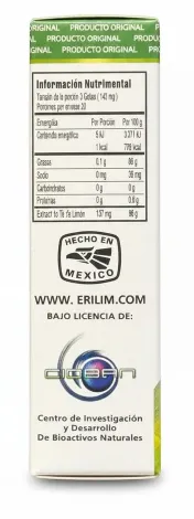 ERILIM es un extracto natural de Hierba de Té de Limón (Cymbopogon citratus) en presentación de gotas — fórmula concentrada para apoyo al bienestar estomacal y digestivo. Tratamiento de 14 días, presentado en frasco gotero (3 ml). No es medicamento; uso responsable. Dosis estándar (según fabricante): tomar 1 gota diluida en medio vaso de agua o té tibio 10 minutos antes o después de cada alimento; máximo 3 gotas al día (una por toma). Tratamiento típico: 14 días. Precauciones de dosificación: en personas con presión arterial baja o tendencia a hipoglucemia, se recomienda reducir a 1 gota al día diluida en mayor cantidad de líquido y fraccionada (según instrucciones del fabricante). |