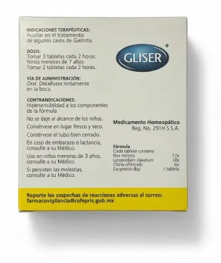 Gliser 52-2 Gastritis es una opción homeopática concebida para actuar como auxiliar en el alivio de molestias relacionadas con la gastritis, incluyendo la acidez, sensación de ardor estomacal o digestión irritada. Su presentación en tabletas facilita el uso frecuente según las necesidades del momento. Modo de empleo sugerido: Adultos: Tomar 3 tabletas cada 2 horas mientras persista el malestar. |