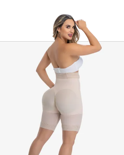 Short levanta glúteos que moldea y estiliza la silueta, con excelente ajuste y control del abdomen bajo, esta elaborado en powernet, cuenta con encaje siliconado en la parte de la cintura que no se enrolla, broches de tres posiciones que se ajustan a la silueta brindando mayor comodidad y ajuste, lleva una banda siliconada en la pierna que no se marca al utilizar prendas ajustadas, delicado diseño en la parte posterior que realza y moldea los glúteos haciendote lucir mas esbelta, realzando tus curvas.
